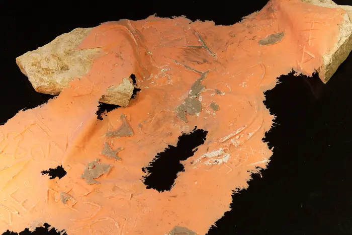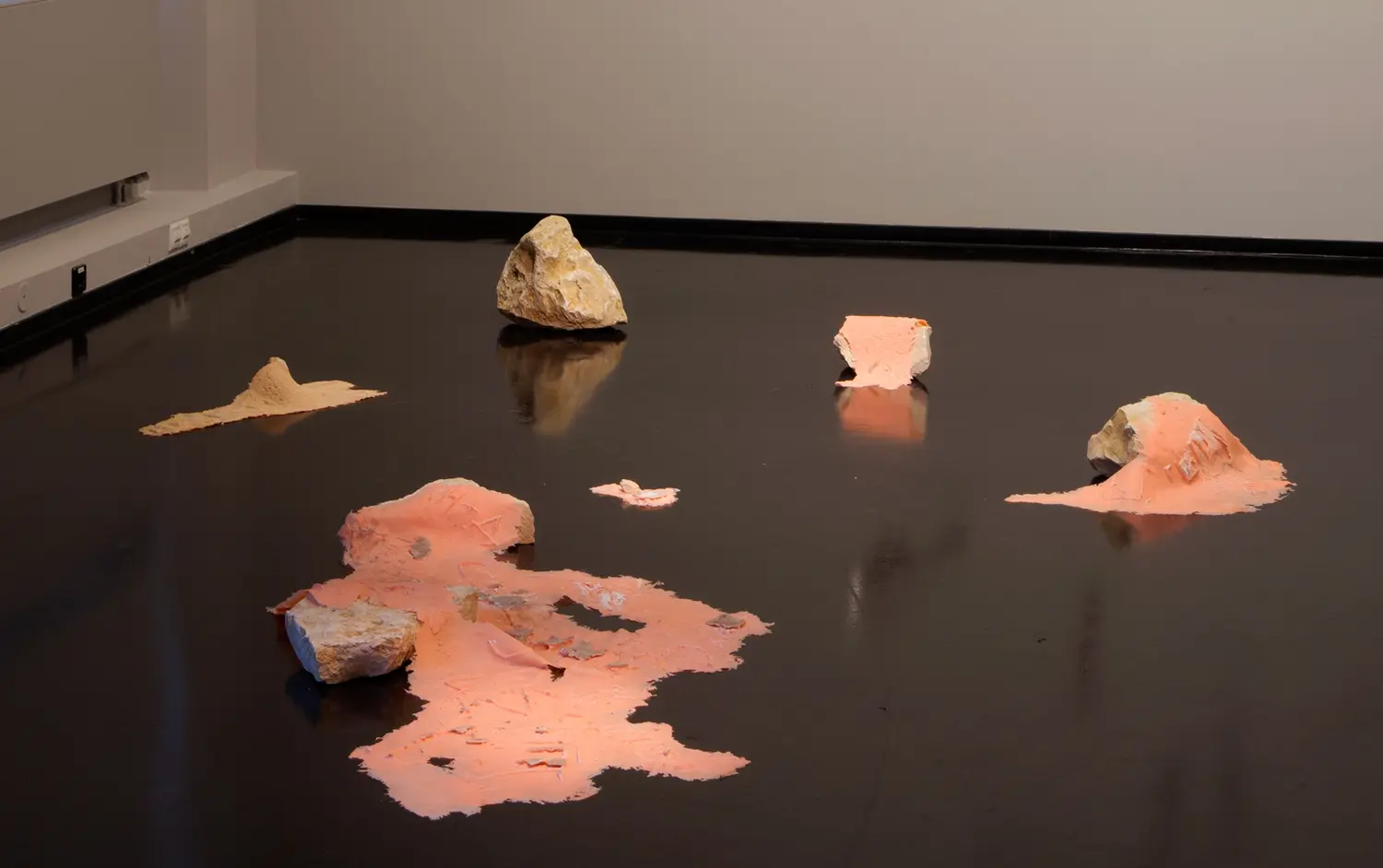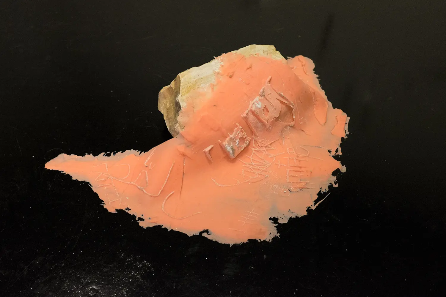 Silikon-Abformungen archaisch anmutender Einritzungen in verschiedenen Alphabeten (Lateinisch, Arabisch, Kyrillisch, Hebräisch, asiatische Zeichen etc.) liegen auf unterschiedlichen Gesteinsbrocken. Darauf konditioniert, Zeichen zu lesen und (als) Schrift zu entziffern, stellt sich angesichts der Objekte die Frage nach ihrer Bedeutung, ihrer Lesbarkeit, aber auch nach dem ursprünglichen Kontext, der historischen Epoche, also der Spezifik ihrer Herkunft. Verweist die Materialität der Silikonformen auf eine – wenn auch nicht identifizierbare – Gegenwart so scheint den Steinen etwas Zeitloses innezuwohnen, das an die im ethnologischen Museum praktizierte Präsentation von Objekten erinnert, die in den meisten Fällen ebenfalls ohne Angabe von Jahreszahlen und Autor*in gezeigt werden.