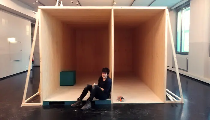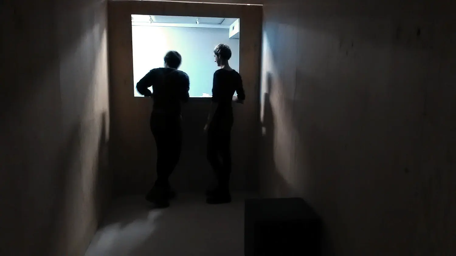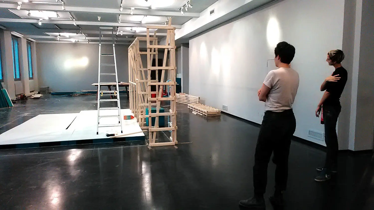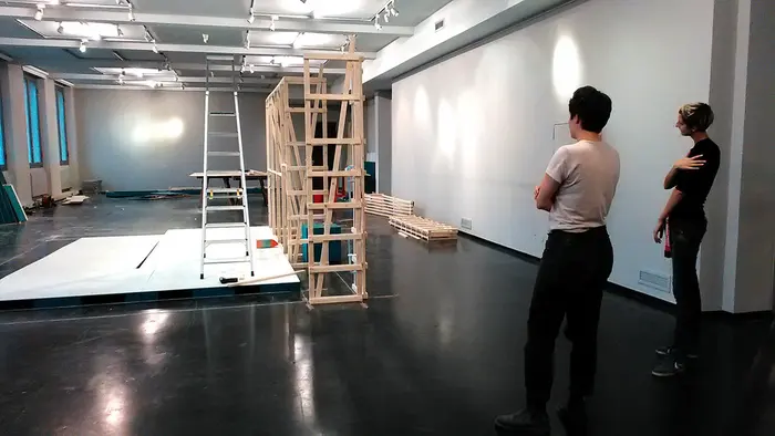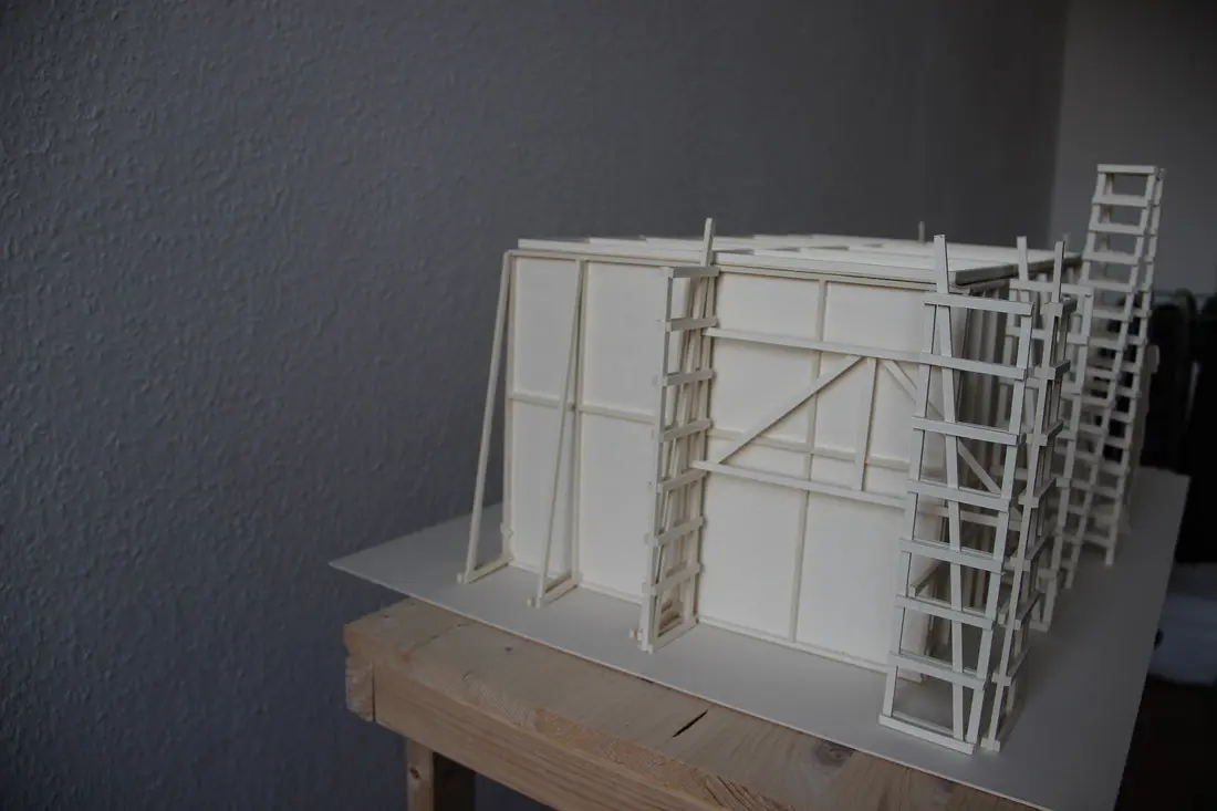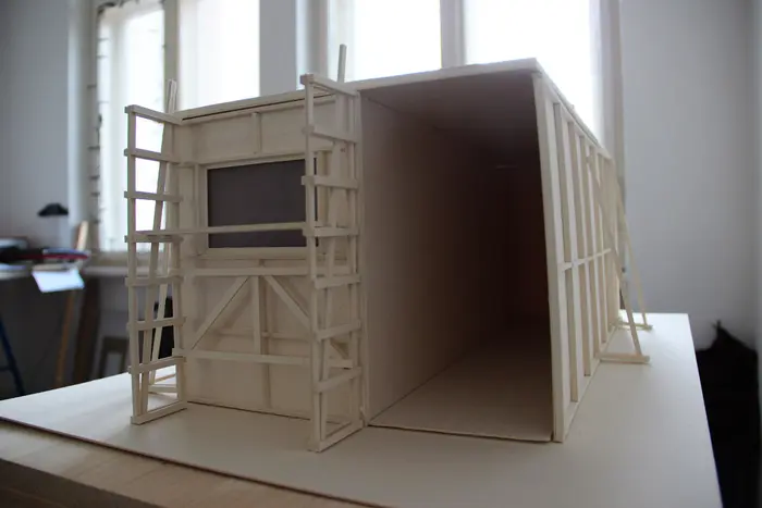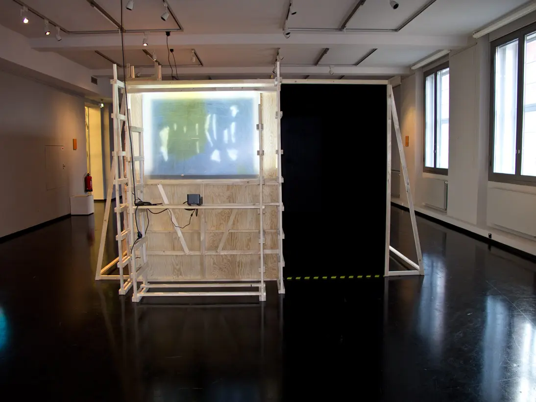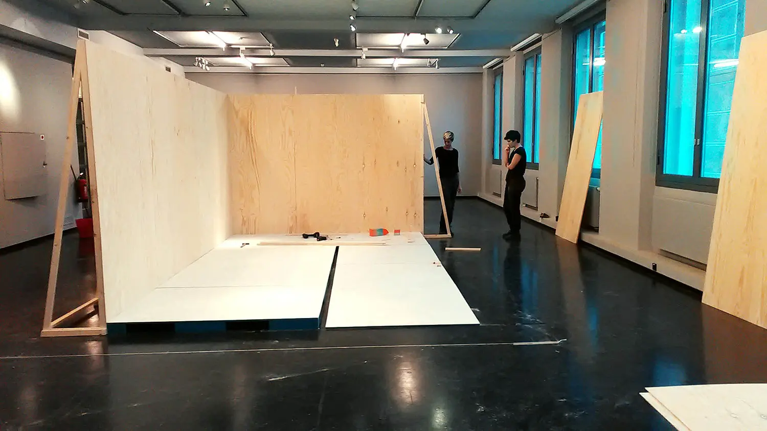 Eine kulissenhafte Raumkonstruktion als begehbarer Pfad durch Projektionen, Fantasien, Ängste. Das Museum als Box, in der dessen Präsentationsformen und Ausstellungseffekte konzentriert dargestellt und somit verdeutlicht werden. Die offenliegende Konstruktion erweckt den Eindruck einer Außenperspektive, die für den Museumsbesucher gewöhnlich nicht sichtbar ist und dessen Struktur hier selbst zum Exponat wird. Gibt es ein Hinter-den-Kulissen oder gibt es nur ein Auf-der-Bühne?