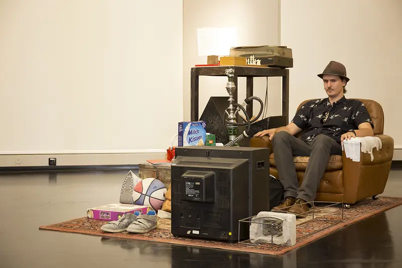 The carpet in the living room is one of these personal memorabilia. It is an expression of yearning for the home he has lost. On the carpet, Manaf Halbouni, together with objects he collected here in Germany, constructs a form of his personal place of longing, his home. Artifacts that show the memories of the old home mingle with objects that create a relationship to the new home.