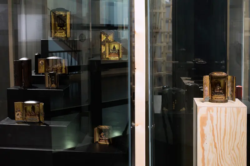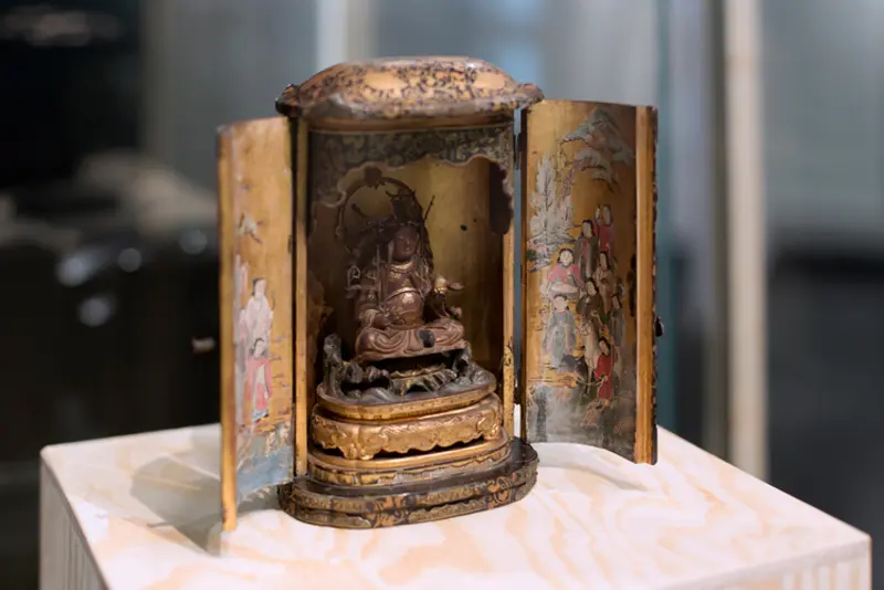 Viele Haushalte in Japan besitzen kleine Altarschreine, in denen Skulpturen von Buddhas und verschiedener buddhistischer Schutzwesen und Götter verwahrt werden. Transportable Miniaturformen dieser Schreine waren bis zum Ende des 19. Jahrhunderts weit verbreitet. Bis heute bieten Läden für religiösen Bedarf diese Figuren und dazu passende Schreine an. Für die Besitzer*innen fungieren die Reisealtäre als Amulette, in denen die heilige Figur haust und den Reisenden vor den Gefahren des Zwischenraumes schützt. Die spirituellen Schutzwesen entstammen unterschiedlichen Pantheons.