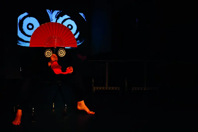 Unsere kleinen Choreographien und szenischen Arrangements finden vor dem Hintergrund der Projektionen statt; sie sind inspiriert von Filmaufnahmen, Beschreibungen und Bilder originärer Funktionen der jeweiligen Masken. Aber natürlich darf nicht erwartet werden, dass wir etwas von diesen magischen Welten originalgetreu erzählen oder veranschaulichen können. Wir sind uns bewusst, dass die Welten, von denen diese Masken Zeugnis ablegen, uns unzugänglich sind, dass wir den ursprünglichen Kontext nur erspüren, nachahmen, dass wir phantasieren müssen. Im besten Fall entsteht der Eindruck, wir würden eine Art neue Ritualität bzw. eine neue Bewegungstextur erschaffen, die ganz eigene symbolische oder metonymische Verweise nahelegt.