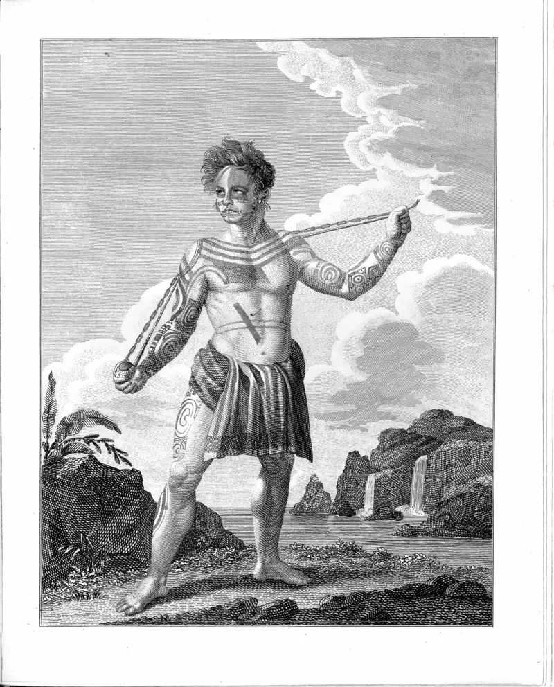 Der auf den polynesischen Gesellschaftsinseln geborene Parridero, der später „Omai“ (1751–1780) genannt und unter diesem Namen bekannt wurde, gelangte 1774 mit dem englischen Seefahrer James Cook (1728–1779) nach Großbritannien. Hier verkehrte er als polynesischer Prinz in den höchsten englischen Kreisen und wurde sogar König George III. vorgestellt. Aufgrund seiner Bekanntheit wurde er auch auf zahlreichen Darstellungen – wie der von Francesco Bartolozzi in der Ausstellung – abgebildet. Gekleidet in Seidenweste und Samtgewand, erscheint er hier als Vertreter einer aristokratischen Schicht oder wie ein römischer Feldherr. Neben dieser Projektion als „edler Wilder“ erregte er auch wegen seiner Handtätowierungen das Interesse der englischen Gesellschaft.