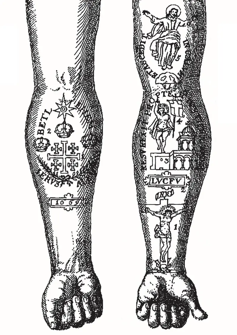 Im Bürgertum waren Tätowierungen verpönt – wohl auch weil Adolf Loos sie mit degenerierten Adligen in Verbindung gebracht hatte. In der Tat erlebte der Hautstich vom Ende des 18. Jahrhunderts bis zum Ersten Weltkrieg unter Adligen einen ersten Höhepunkt: Kaiserin Sisi (1837–1898) wurde ein Anker auf der Schulter oder im Nacken nachgesagt, gesicherte Beweise fehlen jedoch. Jean-Baptiste Bernadotte (1763–1844) ließ sich den Leitspruch der Französischen Revolution – »Liberté, Egalité, Fraternité« (Freiheit, Gleichheit, Brüderlichkeit) mit dem Zusatz: »Tod den Königen« tätowieren. Trotz der rebellischen Geste wurde er später selbst König von Schweden und Norwegen. 1951 ließ sich König Frederik IX. von Dänemark (1899–1972) im US-amerikanischen Magazin Life auf einer Doppelseite ablichten. Auf seiner Brust prangte ein Drachentattoo. Ein ähnliches Drachenmotiv hatte sich bereits Zar Nikolaus II. (1868–1918) von einem japanischen Tattoomeister in den Arm stechen lassen. In Europa galt der Drachen als Chaosbringer, in Ostasien hingegen als Zeichen der kaiserlichen Macht– eine Bedeutung, die europäischen Königen scheinbar gefiel. Kronprinz Frederik von Dänemark (*1968), der Enkel König Frederiks IV., entschied sich für ein anderes Motiv als sein Großvater: Ein Hai am Bein erinnert ihn an seine militärische Ausbildung bei der Marine.