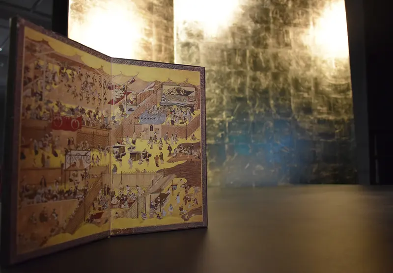 Der byōbu gibt das Leben im Japan des 17. Jahrhunderts auf der Shijō-Straße in Kyoto realitätsnah wieder. Das unbeschwerte Nebeneinander unterschiedlicher sozialer Schichten war in der streng hierarchisch gegliederten Gesellschaft der Edo-Zeit (1603–1868) nur in den Vergnügungsvierteln möglich.
