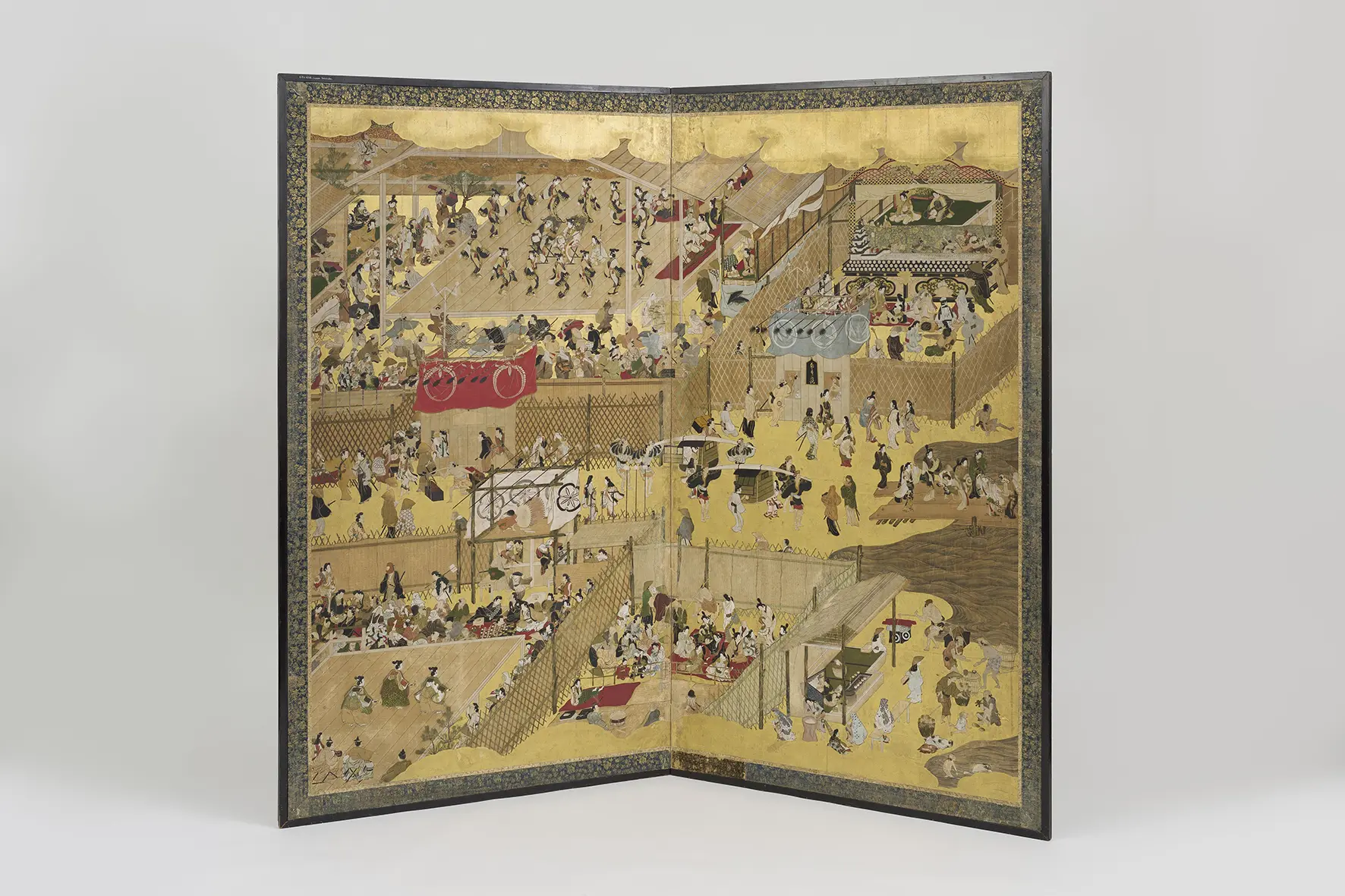 The byōbu realistically depicts life in 17th century Japan on Kyoto’s Shijō street. In the strictly hierarchically structured society of the Edo period (1603-1868), the happy coexistence of different social classes was only possible in the entertainment districts.