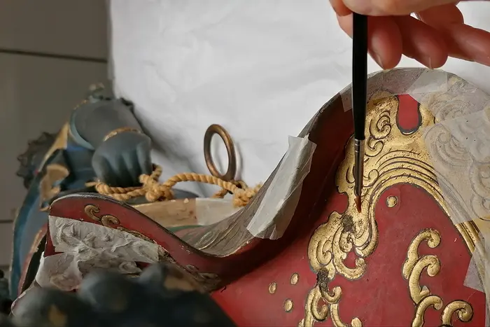 Durch die Förderung der Ernst von Siemens Kunststiftung im Rahmen der Corona-Förderlinie für Freiberufler in öffentlichen Museen ist es nun möglich die mit alten Sicherungspapieren beklebte und von Fassungslockerungen, Fehlstellen und Schmutzauflagerungen geplagte Skulptur und deren wunderbare vielgestaltige Farbfassung wieder ans Licht zu bringen, zu sichern und neue Kenntnisse zur Fasstechnik japanischer Polychromie zu gewinnen.