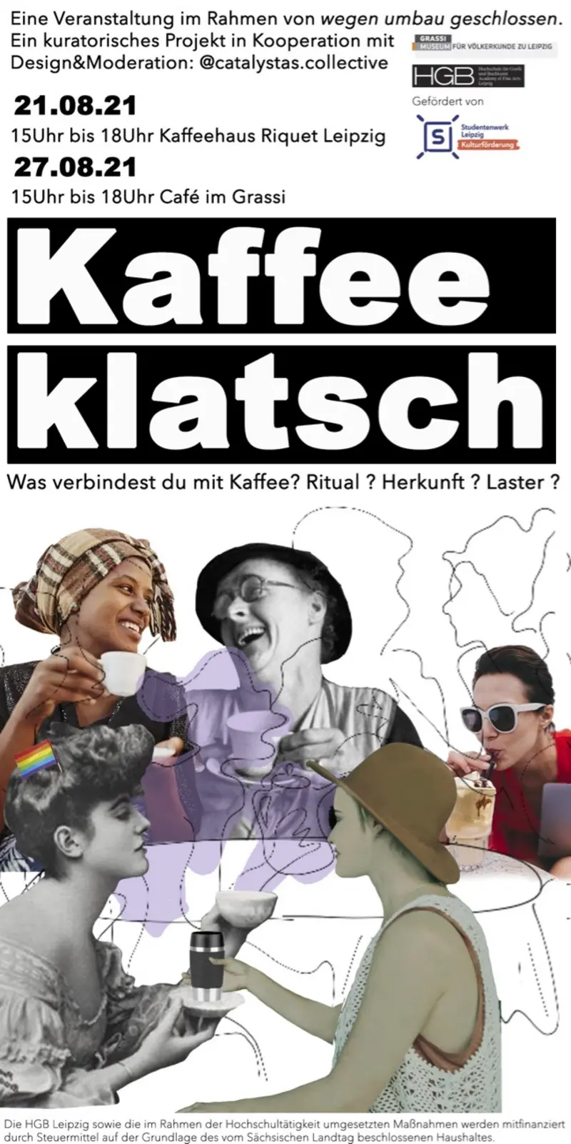 Kaffeeklatsch ist eine Veranstaltung im Rahmen des kuratorischen Projekts wegen umbau geschlossen. Mit dieser offenen Gesprächsrunde möchten die Künstlerinnen von catalystas collective mit der Leipziger Stadtgesellschaft in den Austausch treten und ins Gespräch kommen, darüber was uns mit dem Ritual, dem Ursprung, dem Erbe und dem Laster des Kaffees verbindet.